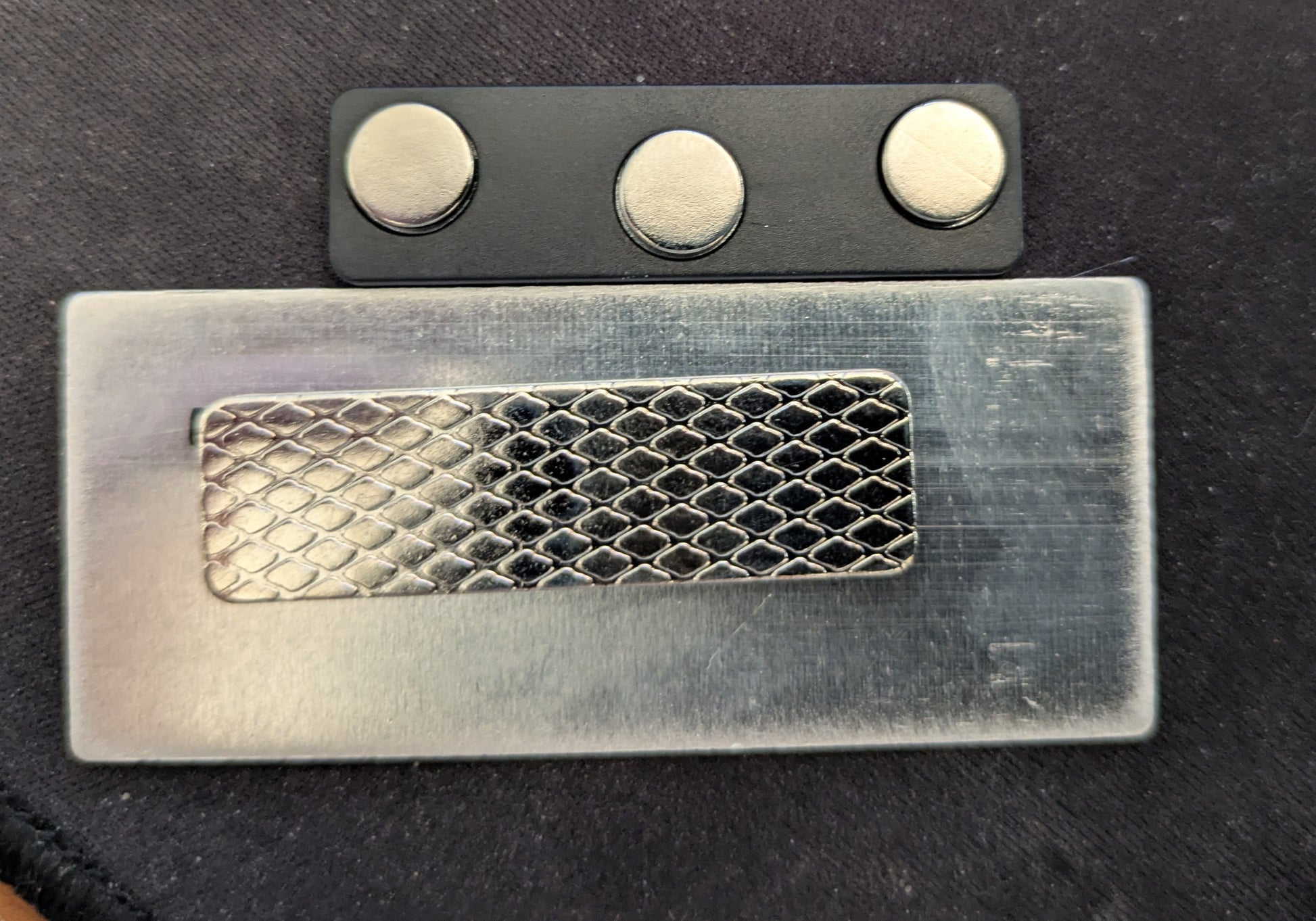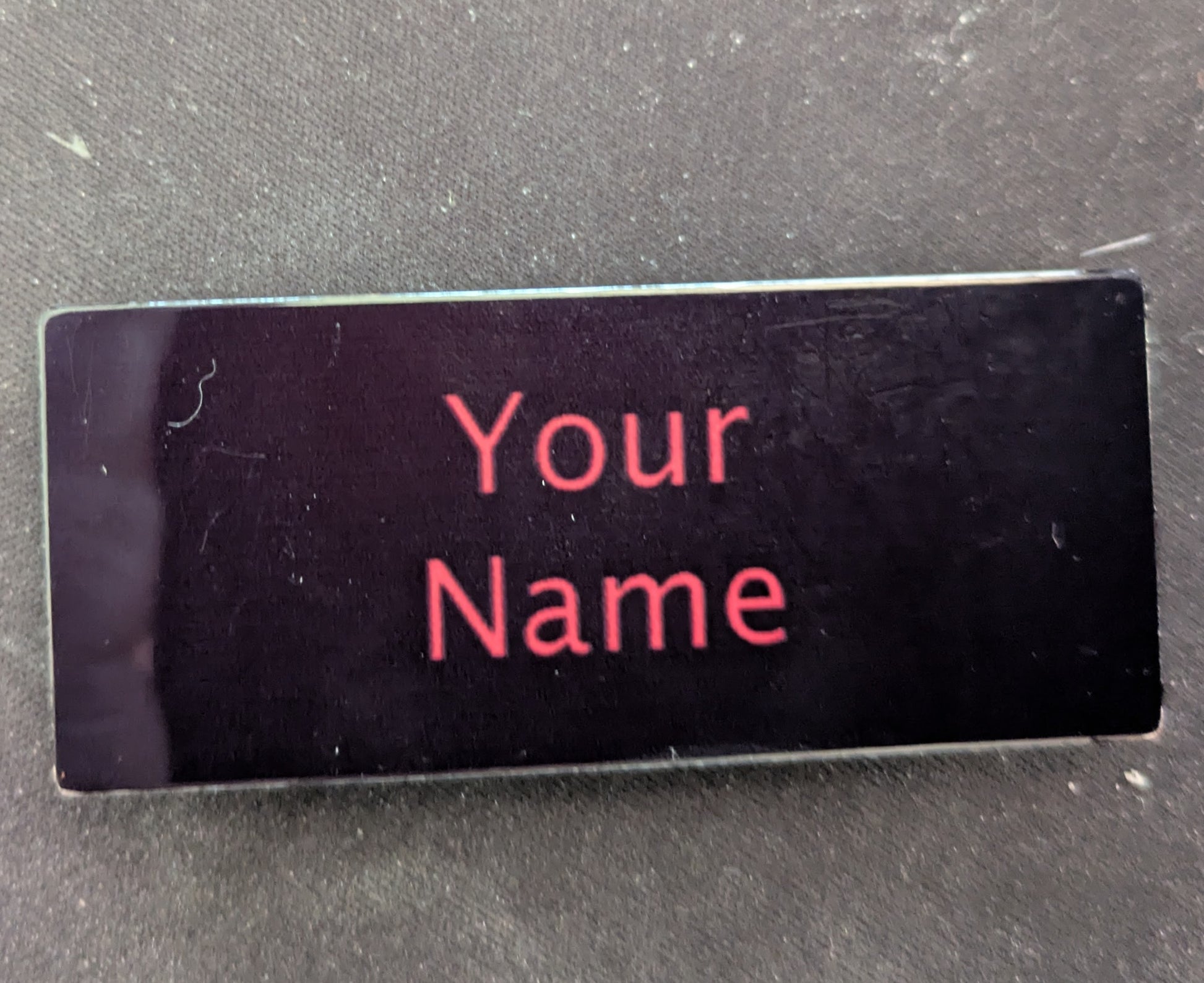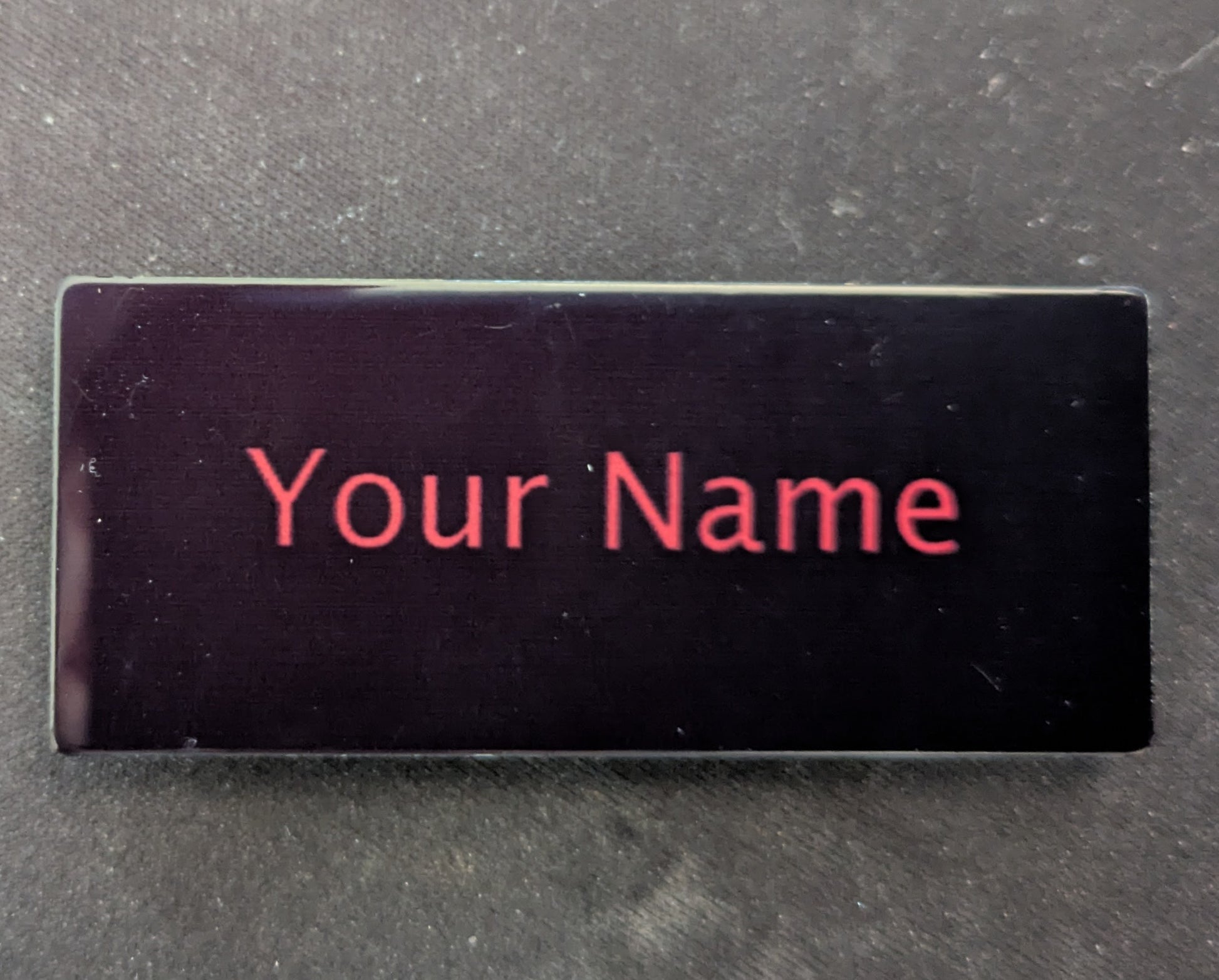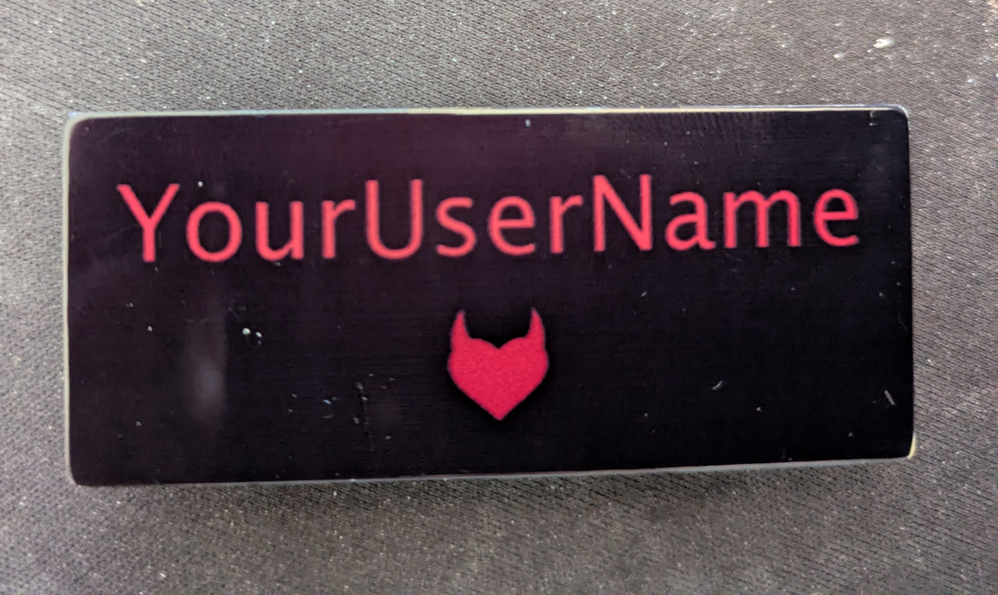 Let people know who you are with a custom name tag with your scene name, user name or title! Black background with red text sublimated on a 1.25x2.75 inch metal plate, these lovely tags use magnets to stay on so as not to damage delicate clothing.